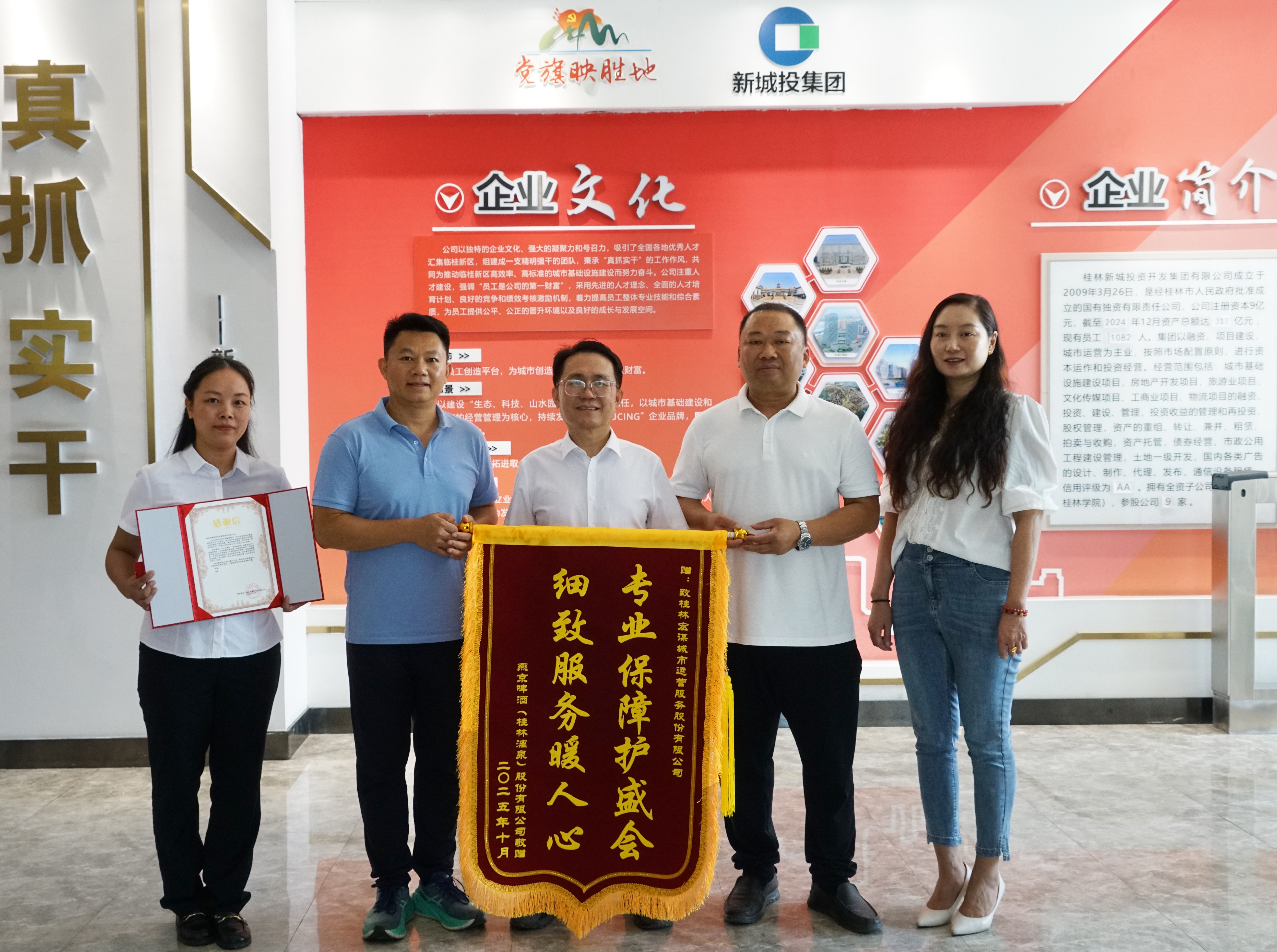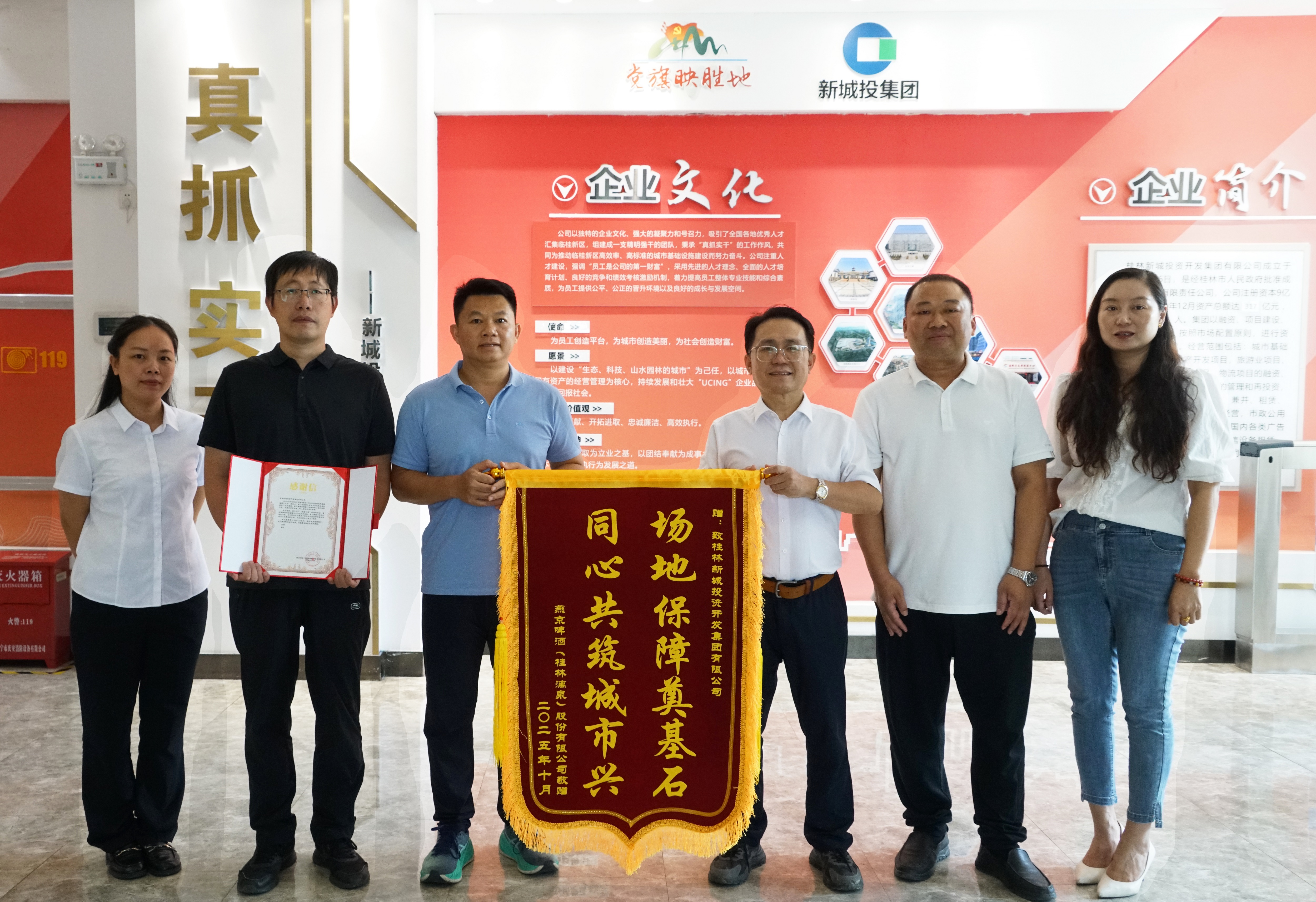 2025年10月16日,燕京啤酒(桂林漓泉)股份有限公司將“場地保障奠基石 同心共筑城市興”、“專業(yè)保障護盛會 細(xì)致服務(wù)暖人心”兩面錦旗及感謝信送到新城投集團,對新城投集團及其子公司宏謀城運公司在2025年9月26 - 10月8日臨桂區(qū)七彩煙花秀暨燕京漓泉啤酒文化節(jié)期間,提供堅實后勤保障,助力活動圓滿落幕表示感謝。
